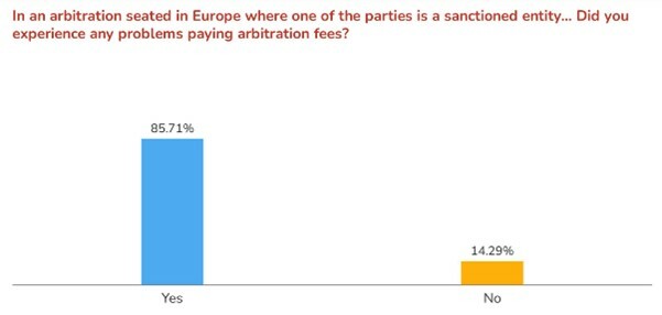 Then the audience was asked to use their phones to answer the following question: “In an arbitration seated in Europe where one of the parties is a sanctioned entity. Did you experience any problems paying arbitration fees?”.
