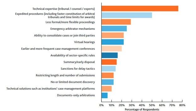 Важным выводом исследования является понимание того, что стороны ждут от арбитражного процесса и в каких инструментах они видят наибольшую необходимость применительно к энергетическим спорам. Так среди важнейших заявлены наличие технической экспертизы (опыта/знаний) у арбитров, представителей и экспертов, возможность проведения ускоренного арбитража (в том числе ускоренное назначение состава арбитража, укороченные сроки для вынесения решения), возможность консолидирования дел и включения в процесс третьих сторон, возможность виртуальных слушаний, наличие специализированных регламентов, наказания за затягивание процесса, уменьшение сроков подачи и числа состязательных документов, вынесение решений по документам.